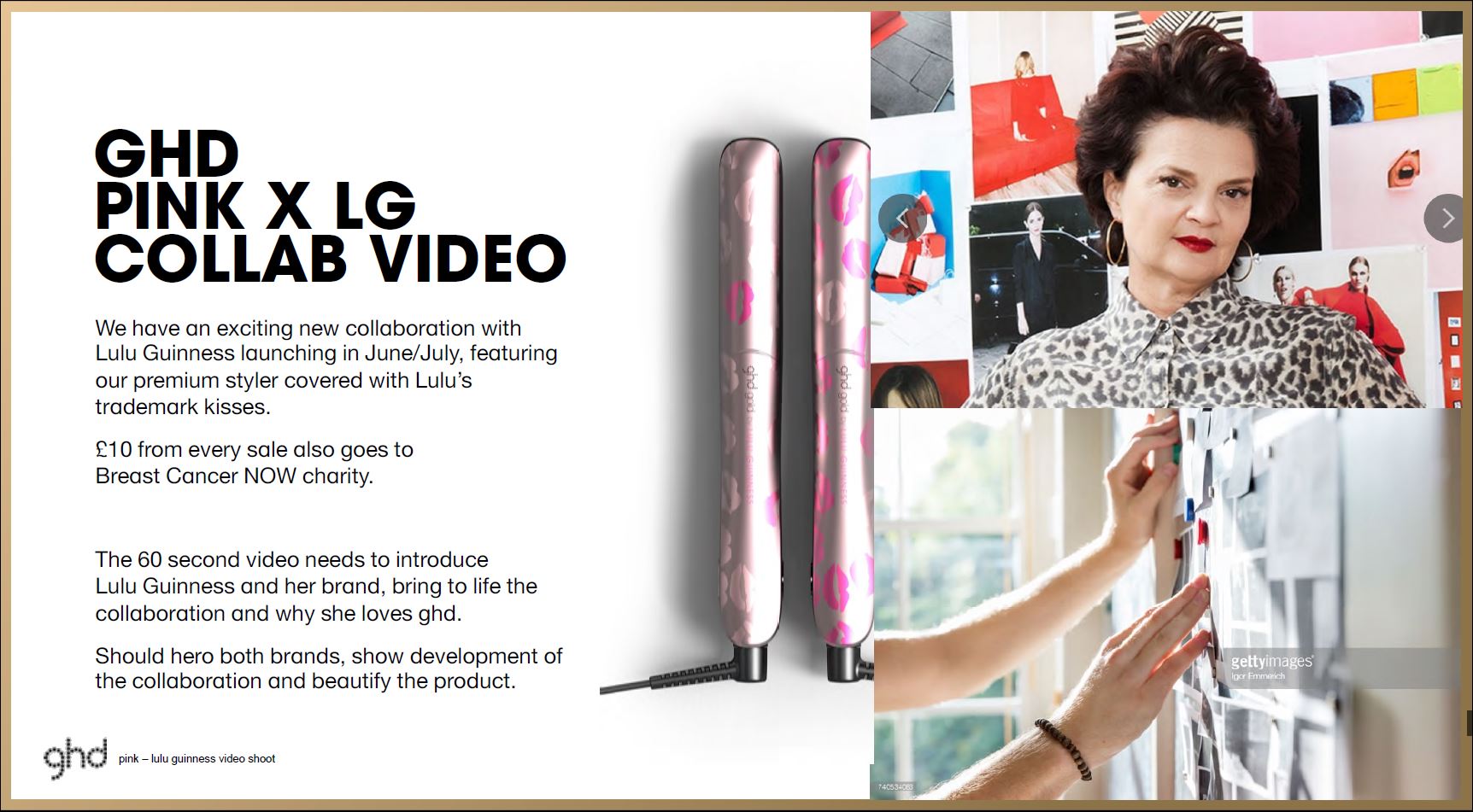 Interview with Lulu Guinness for her collaboration with ghd for a limited edition styler. The creative needed to tell the LLGxghd story, show how the design process had developed and obviously showcase the hero product.